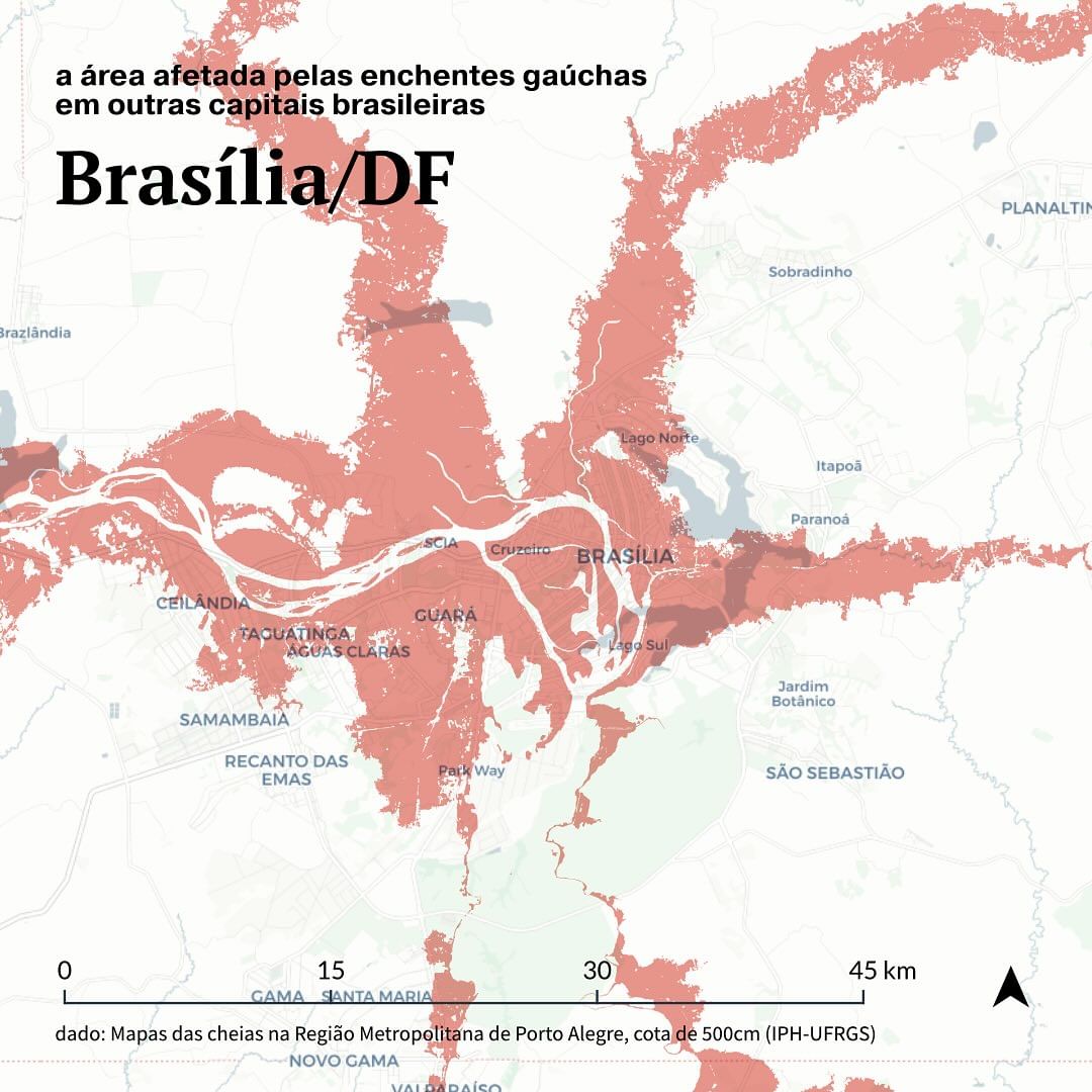 Uma sobreposição de mapas que visa dar noção do tamanho do desastre para moradores de outras regiões do país foi divulgada pelo escritório de arquitetura Versa e pelo estúdio Urb Ideias nesta 3ª feira (7).