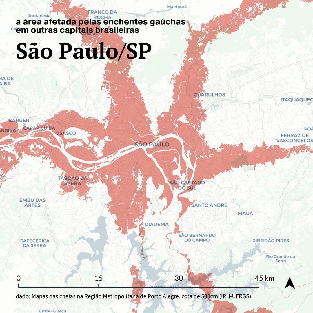 “Não é um mapeamento de áreas inundáveis nas cidades e tampouco de equivalência de população afetada, uma vez que topografia e densidade demográfica variam de cidade para cidade”, esclarece o grupo responsável pelos mapas.