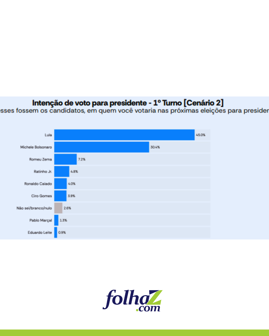 No cenário com a ex-primeira-dama Michelle Bolsonaro (PL), Lula abre 14,6 pontos de vantagem, com 45% contra 30,4% dela.