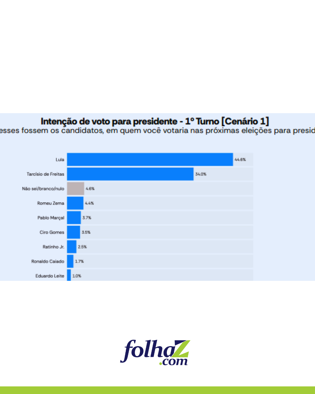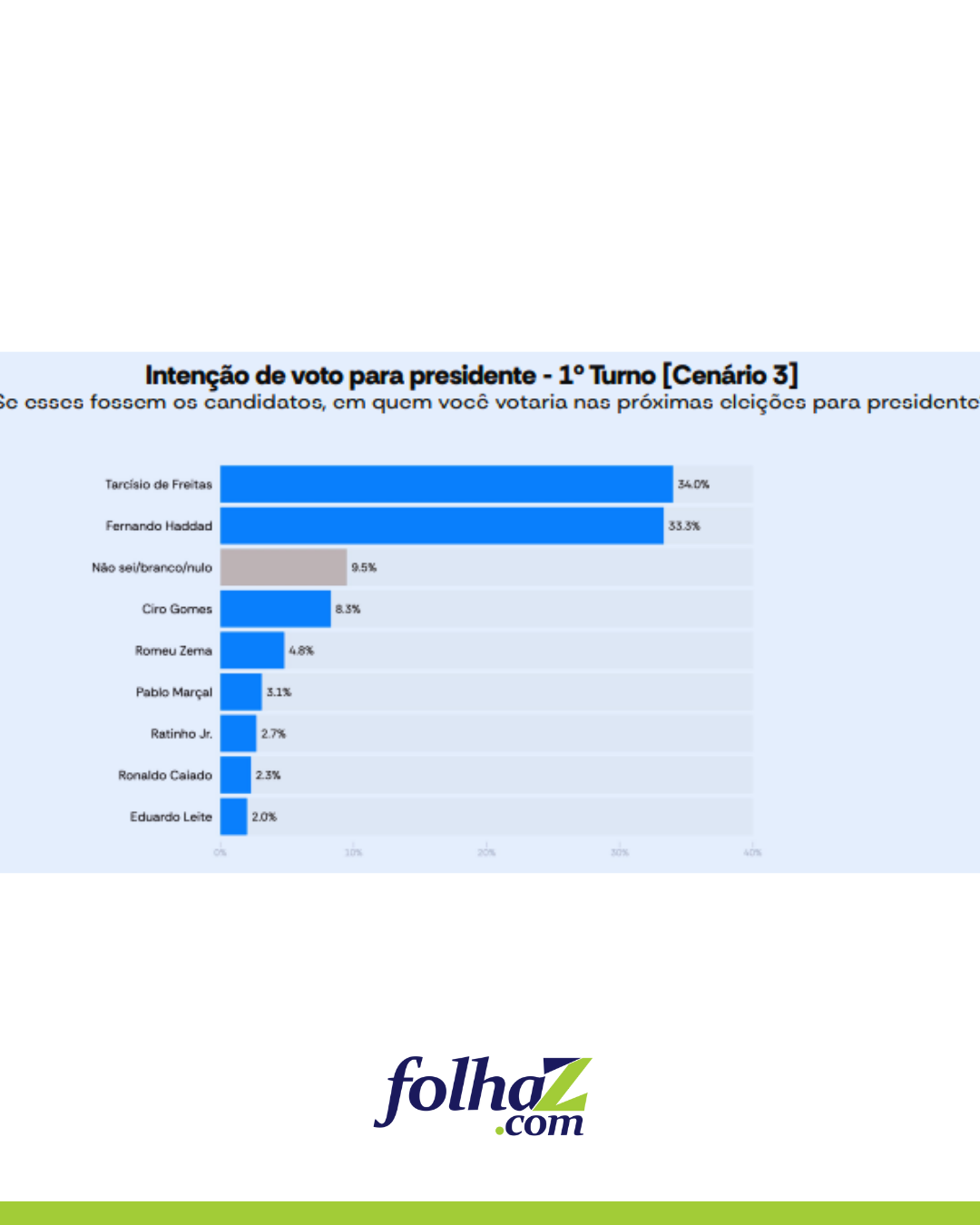 Quando o nome de Lula é retirado do cenário, Tarcísio e o ministro da Fazenda, Fernando Haddad (PT), empatam dentro da margem de erro: 34% para Tarcísio e 33,3% para Haddad.