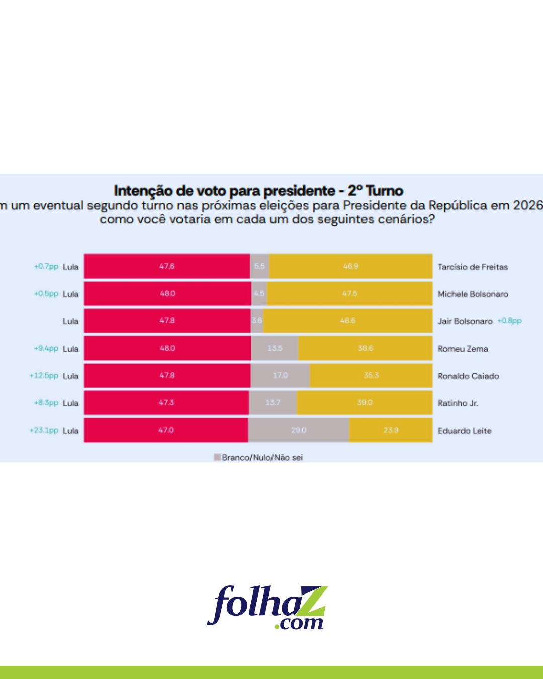 O presidente Lula e o ex-presidente Jair Bolsonaro, atualmente inelegível, estão empatados na corrida para as eleições de 2026, tanto no 1º quanto no 2º turno.
