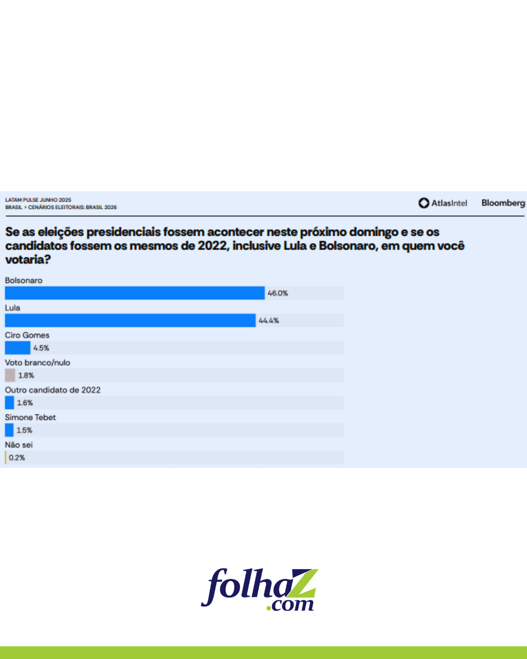 Esse é o resultado mais recente divulgado pelo Instituto Atlas Intel, em parceria com a Bloomberg, nesta 3ª feira (8).
