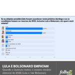 No cenário que reproduz a disputa de 2022, Lula aparece tecnicamente empatado com seu antecessor dentro da margem de erro: