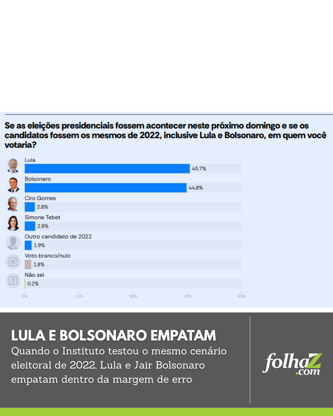 No cenário que reproduz a disputa de 2022, Lula aparece tecnicamente empatado com seu antecessor dentro da margem de erro: