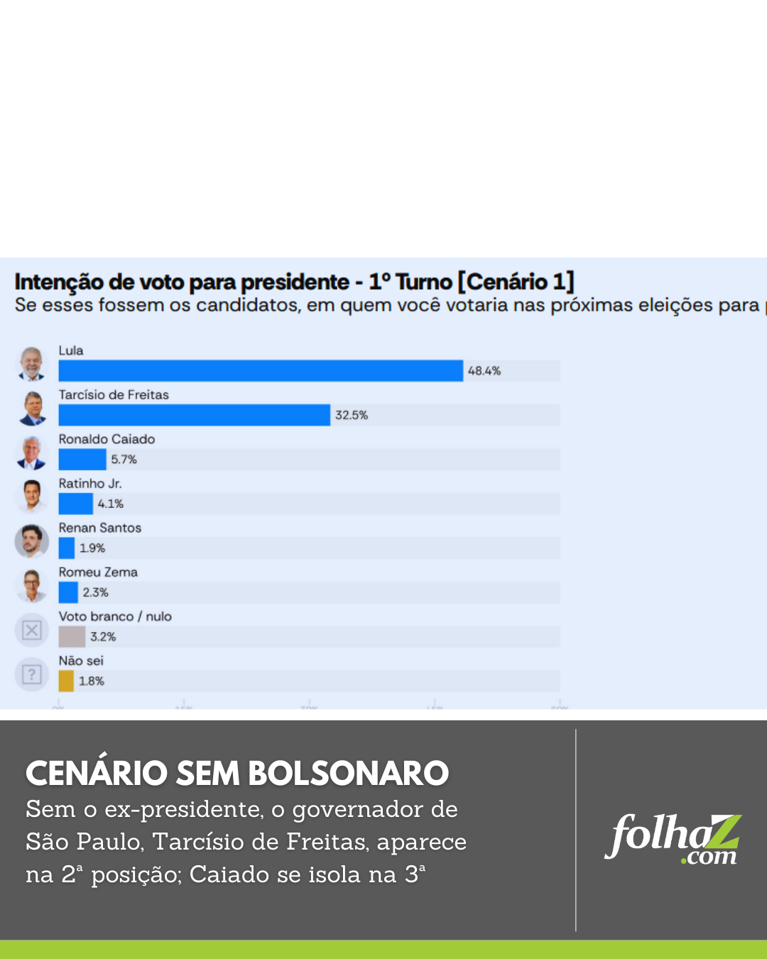 Sem Lula, a disputa fica acirrada entre Fernando Haddad e Tarcísio, enquanto Caiado mantém a 3ª colocação.