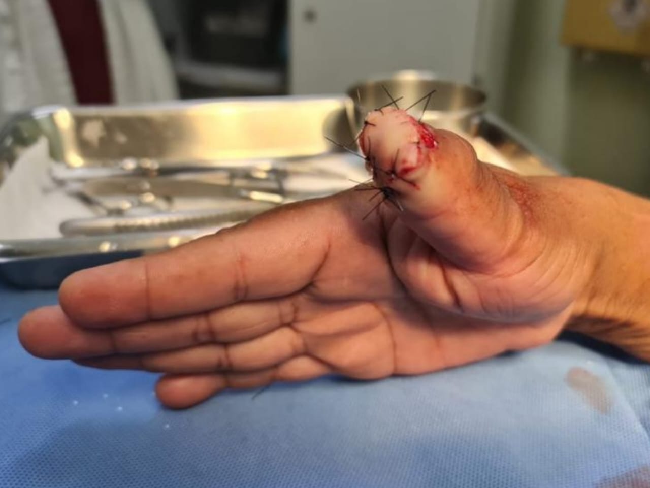 O subtenente teve parte do polegar direito arrancado e passou por cirurgia.