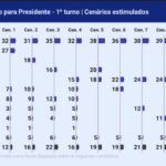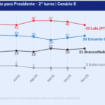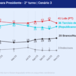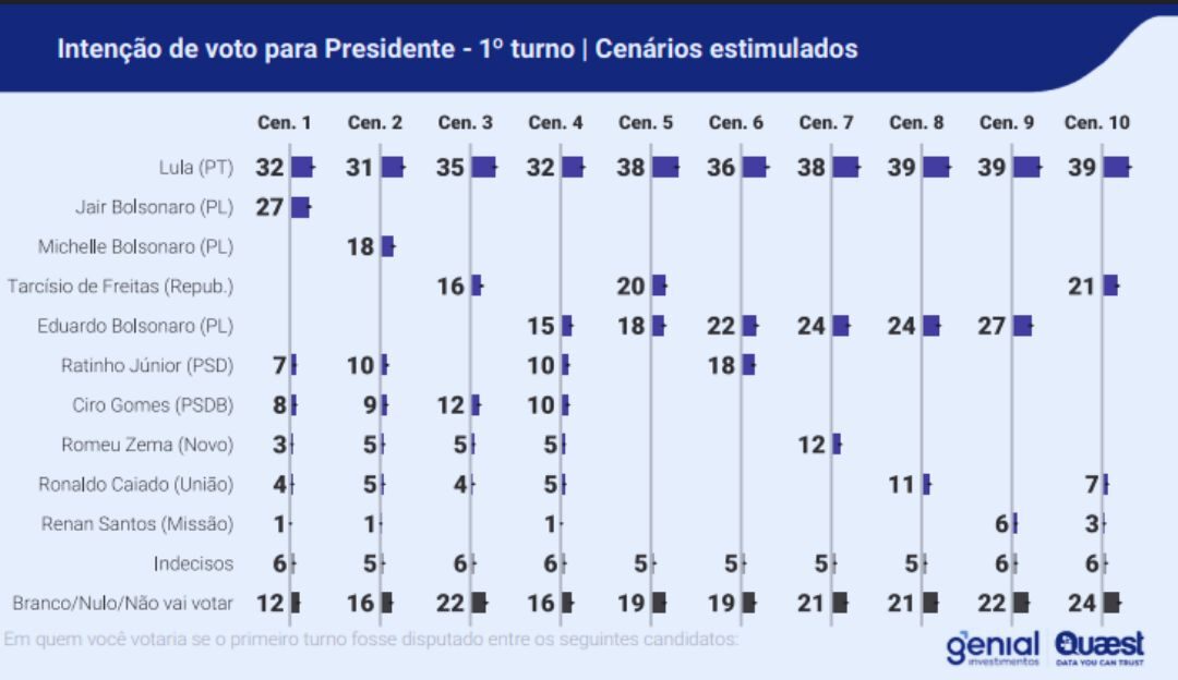 Lula também atinge o percentual nos cenários 9, quando há apenas os nomes de Eduardo e Renan; e 10, quando é incluído o nome do governador de São Paulo, Tarcísio de Freitas (Republicanos) e de Santos.