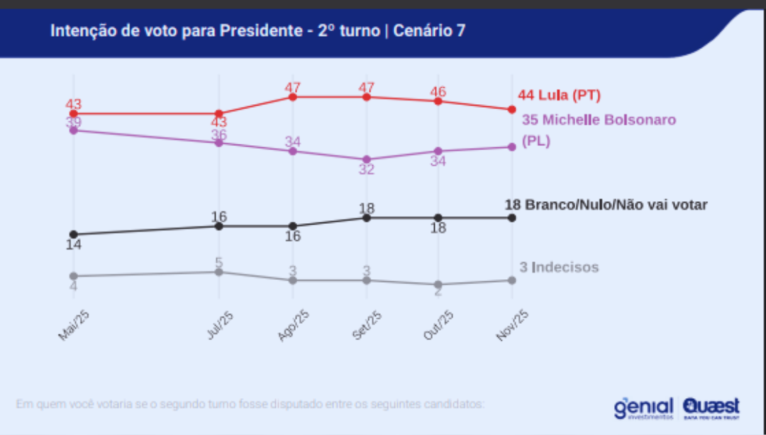 A pesquisa Genial Quaest foi realizada entre 6 e 9 de novembro. Foram entrevistados 2004 eleitores em todo o Brasil.
