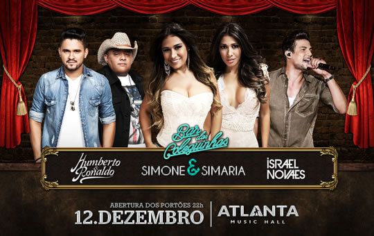 Para os fãs dos últimos hits sertanejos produzidos pelo Brasil a fora, o “Bar das Coleguinhas” é um evento imperdível. Contando com Simone & Simaria, Humberto & Ronaldo, Israel Novaes e DJ Rafael Ramalho, a festa promete muita diversão no Atlanta Music Hall no dia 12 de Dezembro.