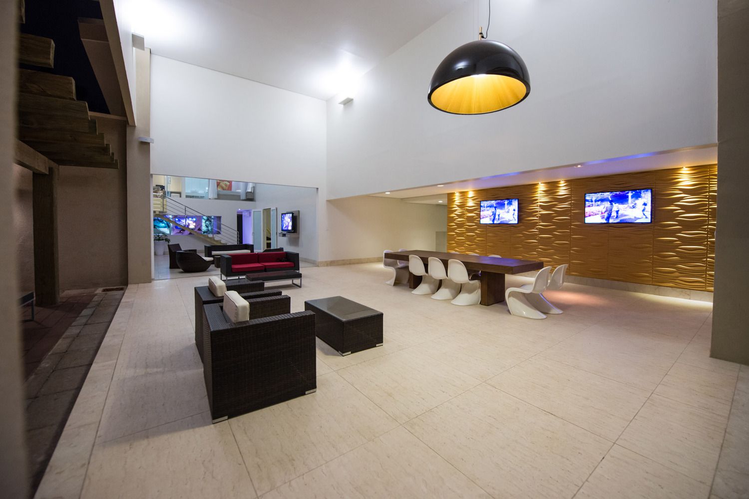 A Suíte Lounge tem cinco quartos, oito camas, garagem para nove carros, seis hidromassagens, 15 TVs (de 46′ a 55′ – LED), 12 aparelhos de ar-condicionado Split de 24.000 BTUs cada, três piscinas com teto solar em uma delas, ampla área Gourmet com churrasqueira, pergolado, três saunas, boate (120m²) com pé direito duplo / mezanino e pista de dança com piso líquido colorido. Entrada e cozinha independentes para eventos – que podem ser os mais diversos.