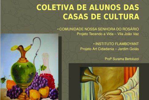 Abertura da Coletiva dos alunos das Casas de Cultura acontece hoje, dia 20, a partir das 20h, no Palácio da Cultura, e reunirá trabalhos de grupo formado pela professora Surama Bertolucci. Artistas são originários da Comunidade Nossa Senhora do Rosário, por meio do Projeto Tecendo a Vida, e do Instituto Flamboyant, pelo Projeto Art Cidadania.