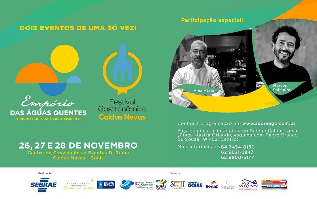 No Centro de Convenções e Eventos Di Roma, em Caldas Novas, de quarta-feira, 26, a sexta-feira, 28, o Sebrae e parceiros realizam os eventos Empório das Águas Quentes – Turismo, Cultura e Meio-Ambiente e Festival Gastronômico de Caldas Novas com as participações do ator e produtor Marcos Palmeira e do chef de cozinha e restaurateur Alex Atala. É uma ação conjunta para promover o turismo, cultura, meio-ambiente e gastronomia por meio do conhecimento, das boas práticas, das redes sociais, de mostras culturais, de divulgação dos Circuitos Turísticos de Goiás, de palestras e dos encontros setoriais.