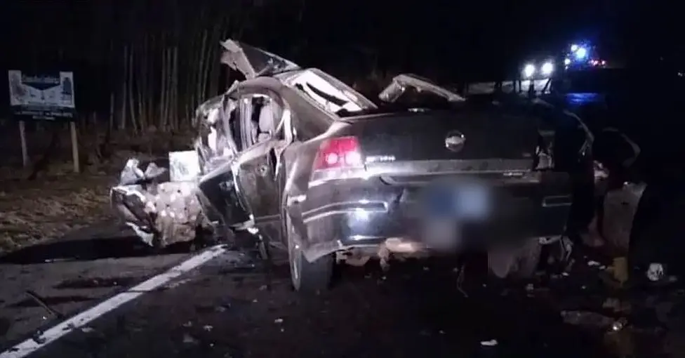 O carro, que invadiu a pista contrária e acertou a carreta de adubo, ficou completamente destruído.