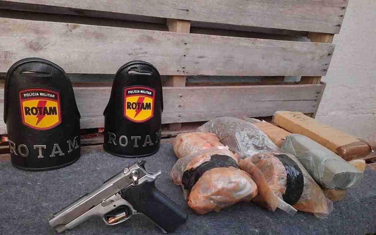 Segundo a polícia, com ele foram apreendidas uma pistola calibre 9 mm, 5 peças de maconha e duas de Skank, que é uma espécie mais forte da droga.