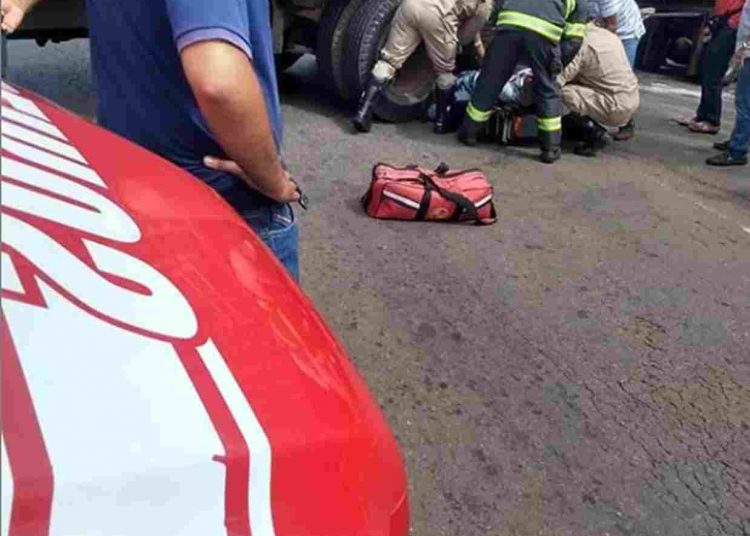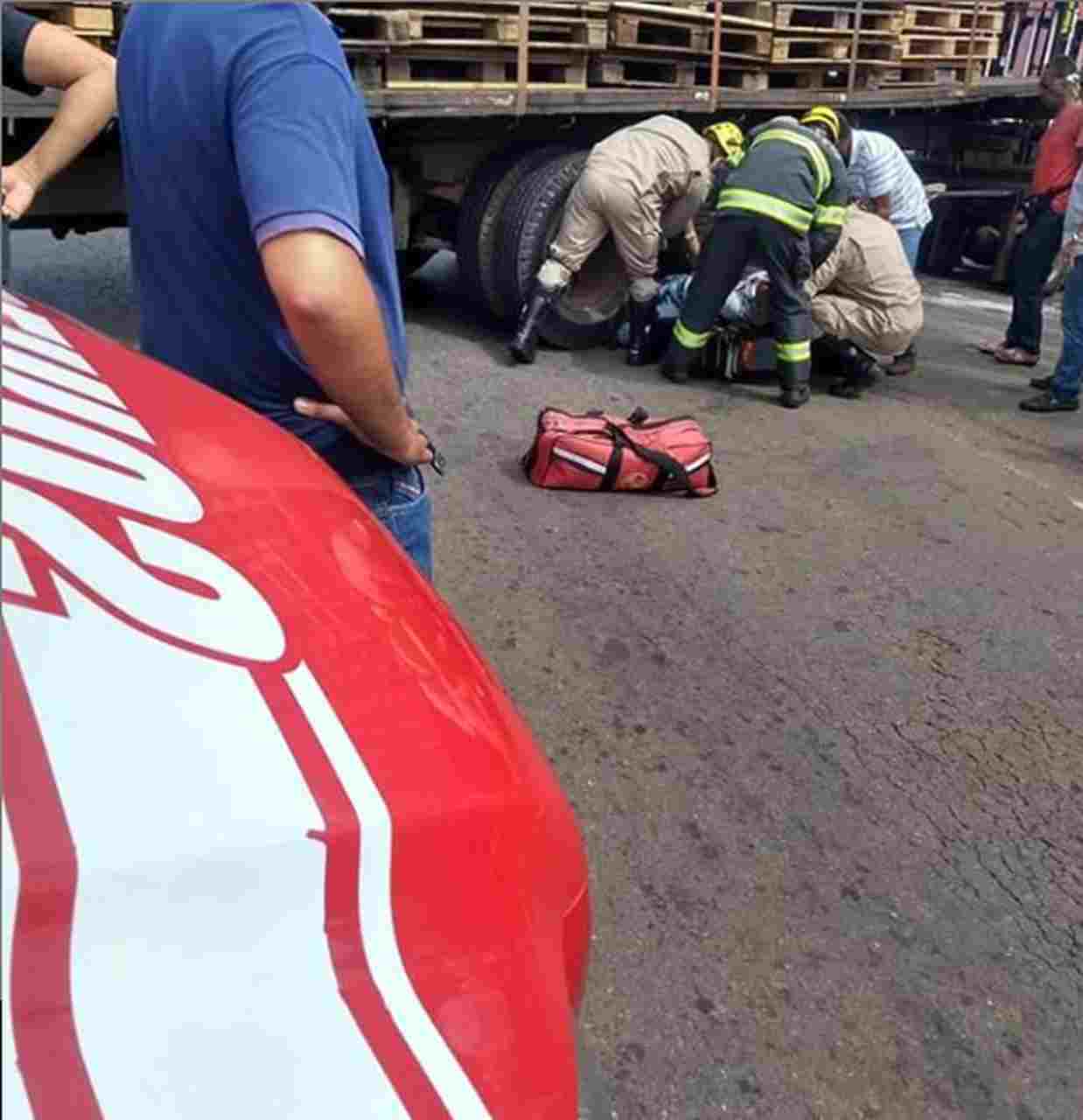 Com a batida, o motociclista de 32 anos ficou preso entre as rodas traseiras do caminhão.