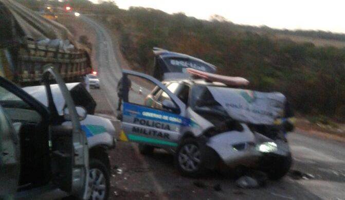 Acidente envolvendo um caminhão e duas viaturas da Polícia Militar (PM) deixa seis pessoas feridas. Quadro delas militares. O acidente ocorreu na manhã de hoje, 20, na GO-210, trecho que liga Catalão a Goiandira, próximo ao aterro sanitário, no Sudeste do estado.