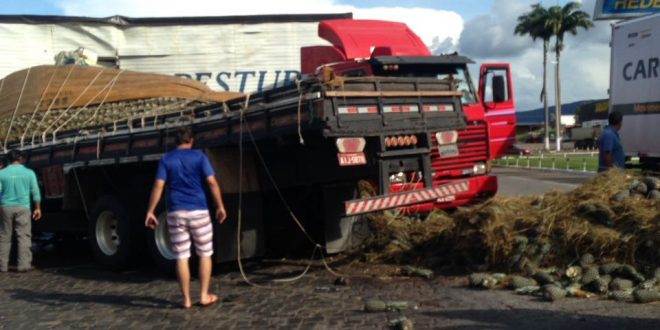Segundo uma testemunha, o caminhão baú entrou no posto sem olhar para a BR e colidiu em cheio com o caminhão que transportava abacaxi.
