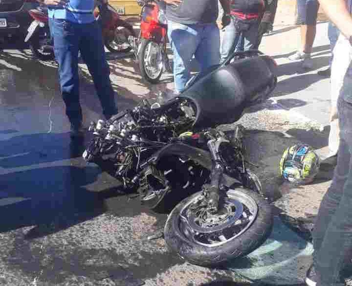 Duas pessoas ficaram feridas após grave acidente entre uma moto e um carro, na Avenida Uru, no Setor dos Afonsos, próximo a agência do INSS em Aparecida de Goiânia.