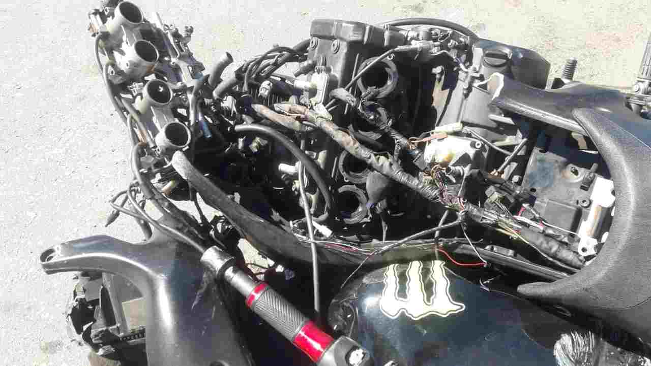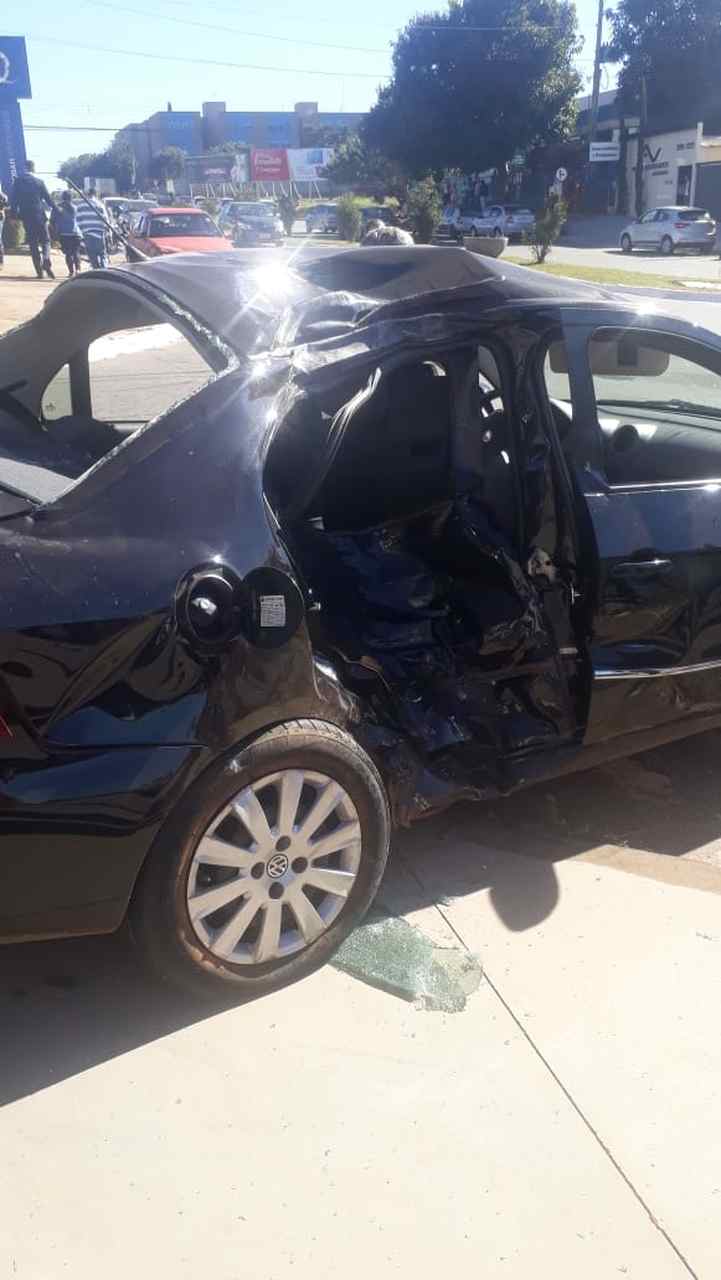 O choque aconteceu entre a moto e a parte traseira do lado do passageiro do veículo.