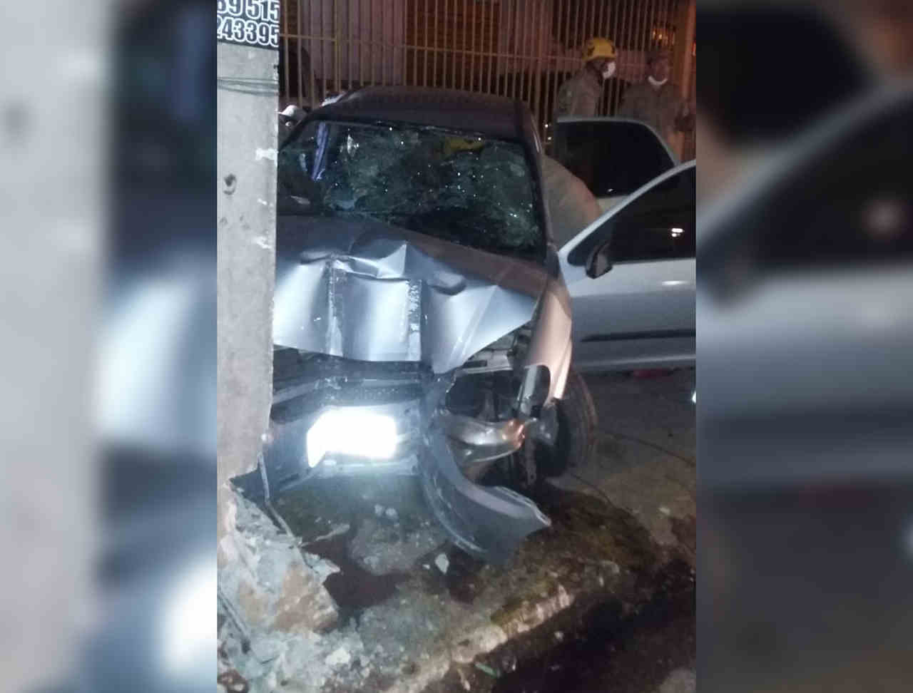 Após a grave colisão, o carro e o poste ficaram bastante danificados.