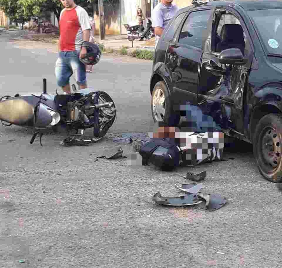 A vítima, que conduzia uma biz de cor preta, chocou-se contra um carro Fiesta. Com isso, a porta dianteira do passageiro ficou bastante danificada.