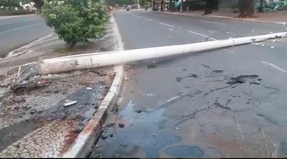 Depois de perder o controle da direção do seu veículo, um motorista colidiu e derrubou um poste de iluminação pública na Praça Cívica na madrugada desta quarta-feira, 28. O motorista sentia dores na clavícula e foi socorrido pelo Corpo do Bombeiros.