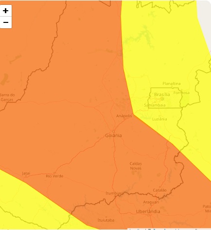 A previsão para esta área em laranja e que cobre praticamente todo o Estado é de chuvas entre 30 e 60mm/h ou de 50 e 100mm/dia.