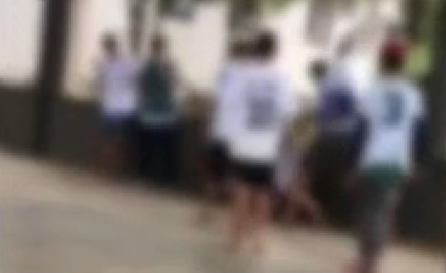 Um vídeo mostra quando um aluno dá uma “voadora” no outro, que cai e é agredido com mais socos e chutes.