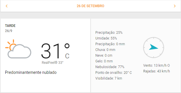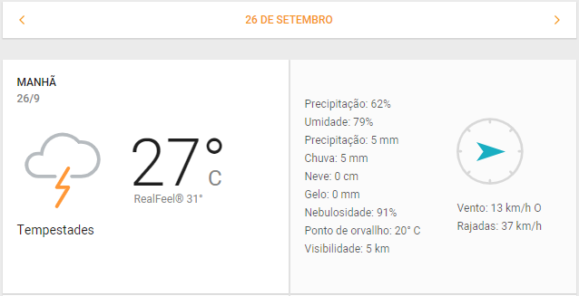 Previsão do tempo na tarde de 26/09, em Aparecida | Foto: Inmet