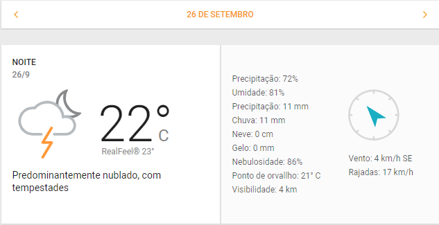 Previsão do tempo na noite de 26/09, em Aparecida | Foto: Inmet