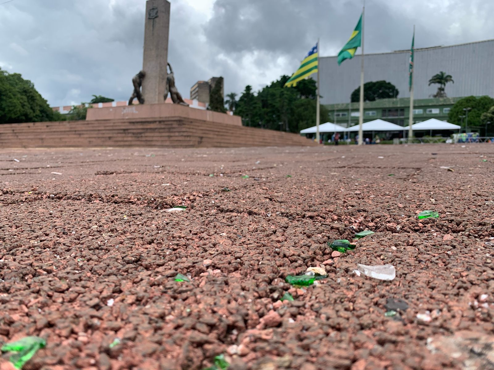 Após Carnaval, chão da Praça Cívica está repleto de cacos de vidro