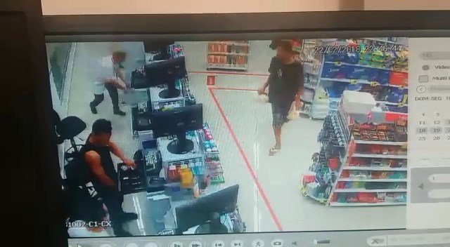 Uma câmera de segurança flagrou o momento em que os dois assaltantes entrara na loja e renderam dois funcionários no local.