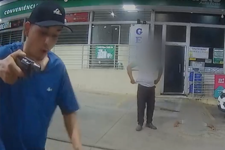 Um vídeo mostra quando o assaltante chega ao posto à pé e o revólver.