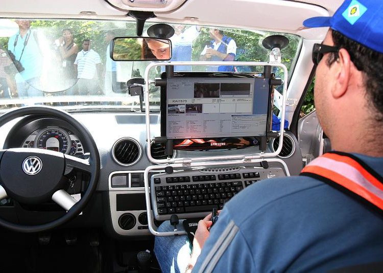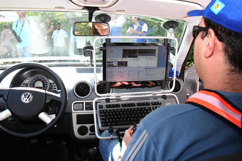 Os veículos que passam pela barreira são vistoriados por um equipamento óptico que pela placa já informa os agentes se o licenciamento e IPVA estão regulares ou não.