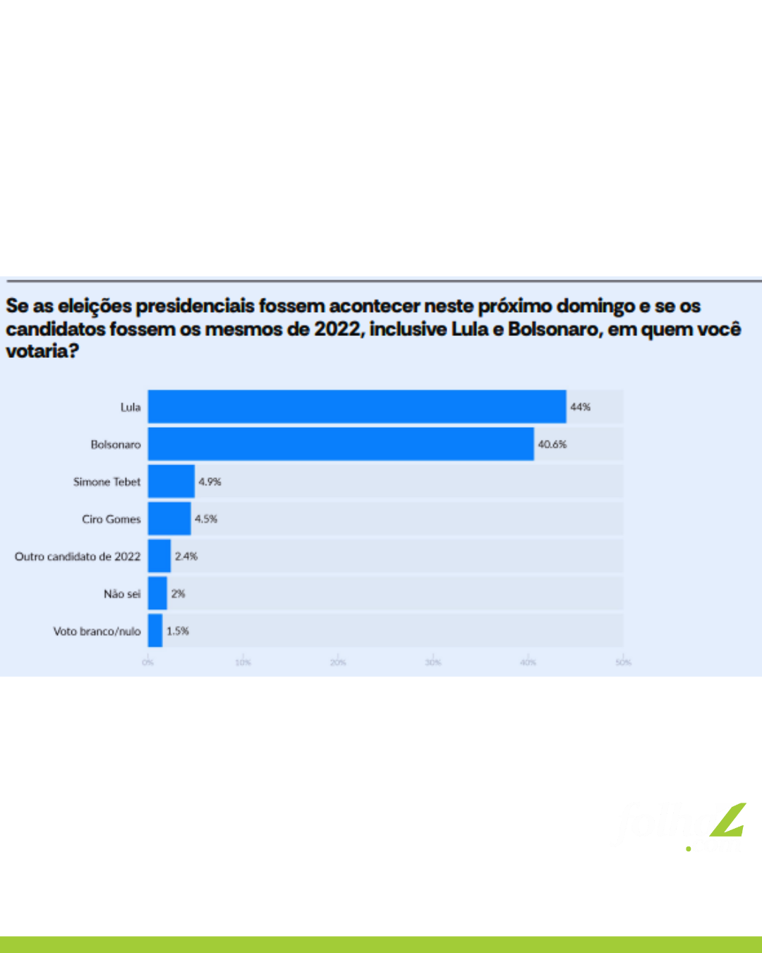Conforme os dados divulgados nesta 2ª feira (11), o petista lidera com 44% o cenário em que os nomes testados foram os mesmos do pleito de 2022.