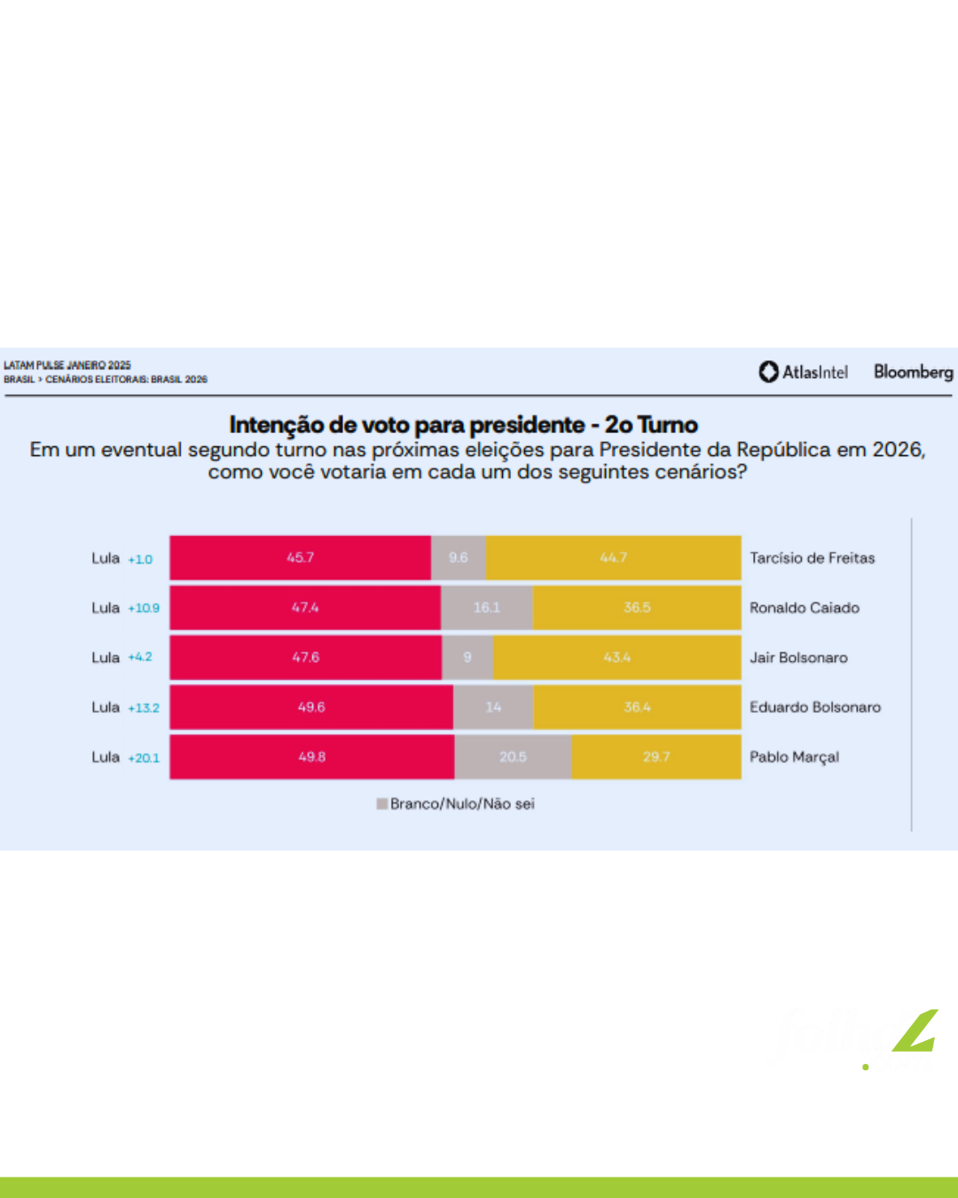 A 2ª pesquisa Latam Pulse divulgada pelo instituto Atlas Intel mostra o presidente Lula (PT) em empate técnico com o ex-presidente Jair Bolsonaro (PL) na intenção de voto para a presidência da República em 2026.