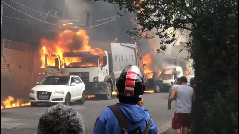 Dezenas de bombeiros e várias viaturas trabalham no local, resgatando as vítimas e combatendo o fogo.