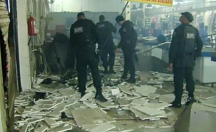 Em seguida, o grupo arrombou a porta do supermercado, explodiu o caixa eletrônico e saiu com o dinheiro. Segundo a PM, parte do teto do estabelecimento desabou.