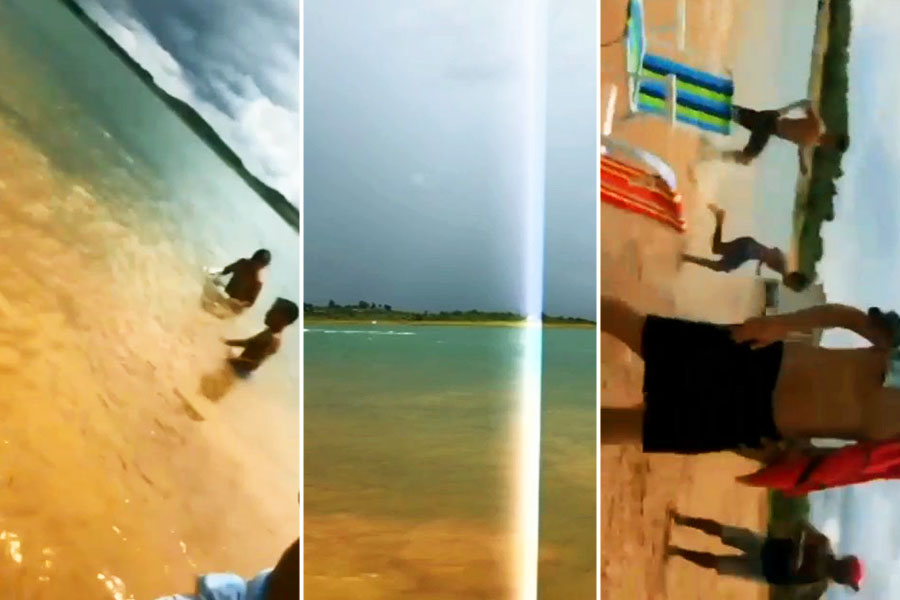 Nas imagens, é possível perceber que várias pessoas tomavam banho no lago quando o estrondo provocado pelo raio assusta os presentes.
