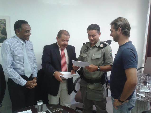 Durante reunião, que aconteceu na sede da Ordem dos Advogados do Brasil/Secção Goiás (OAB-GO), que contou com presença do vice-presidente da instituição e morador do bairro Jardim América, Sebastião Macalé, o líder comunitário Alceu Luiz Teixeira entregou para o comandante da 9ª CIPM, Capitão Cardoso, a escritura do terreno onde será construída a base comunitária; nos arredores do Colégio Estadual Jardim América.