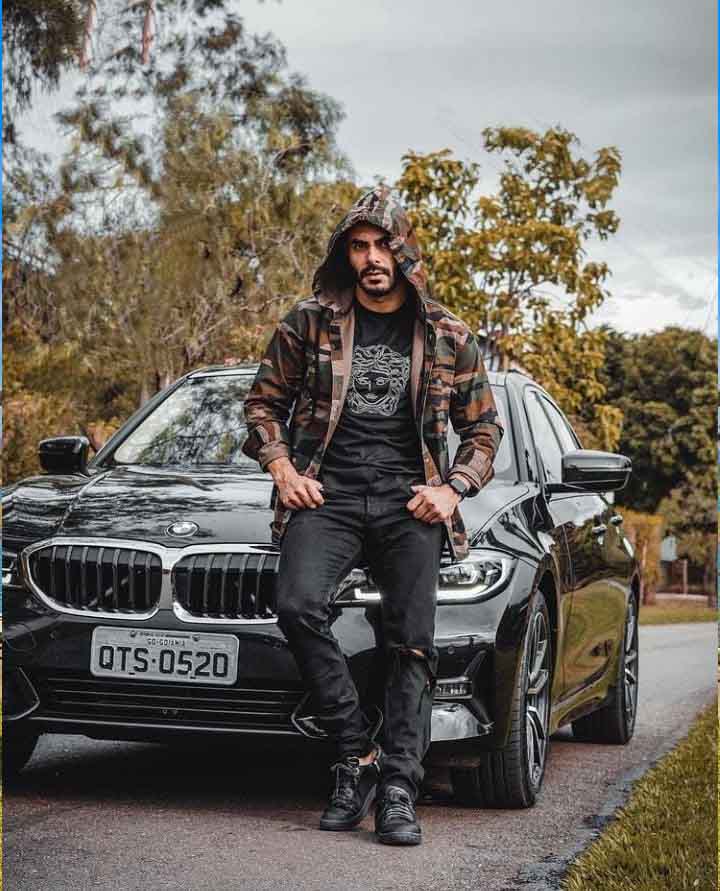 Em uma das postagens em que exibe seus bens, o músico posa ao lado da BMW 320i Série 3, seu grande xodó.