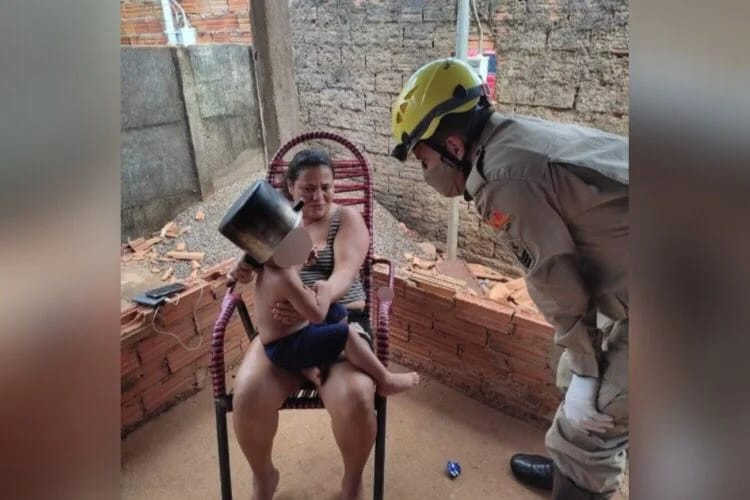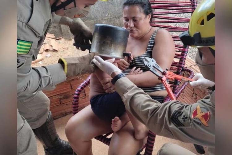 Em Carmo do Rio Verde, a 13 km de Ceres, uma criança de 2 anos ficou com a cabeça presa dentro de uma panela de pressão.