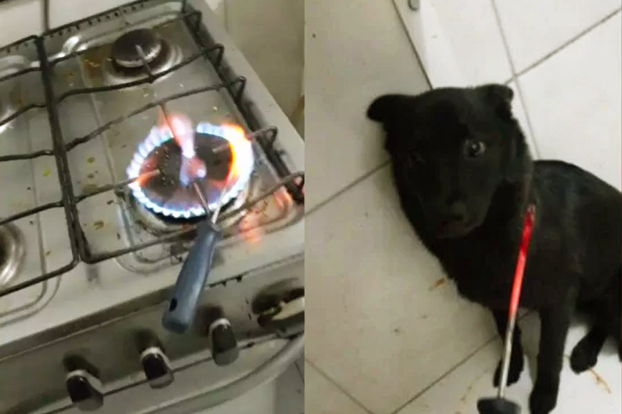 No vídeo acima, um homem que havia levado um fora da companheira, tenta intimidá-la queimando a cadela do casal com uma chave de fenda que ele esquentou no fogão de casa.