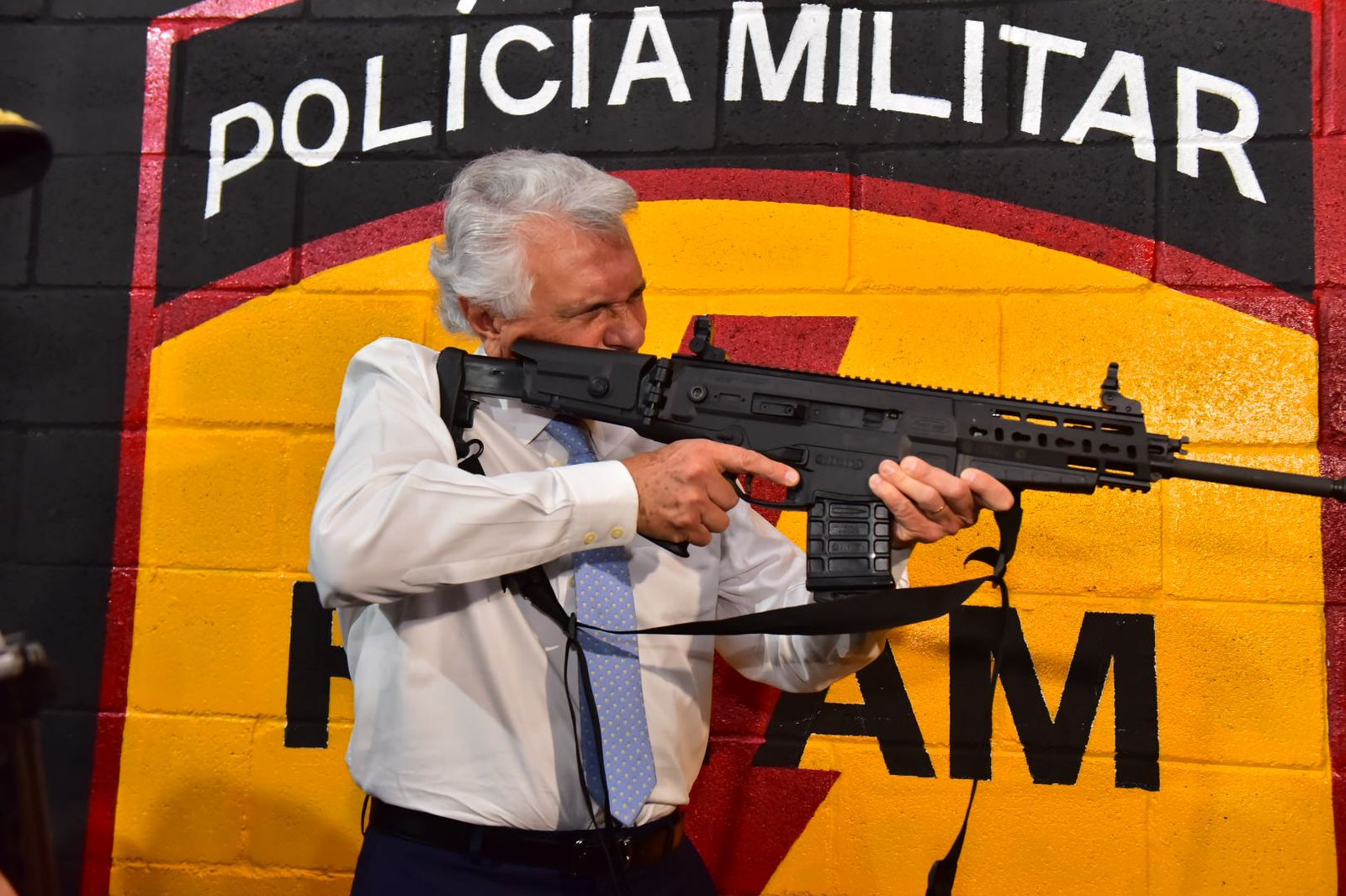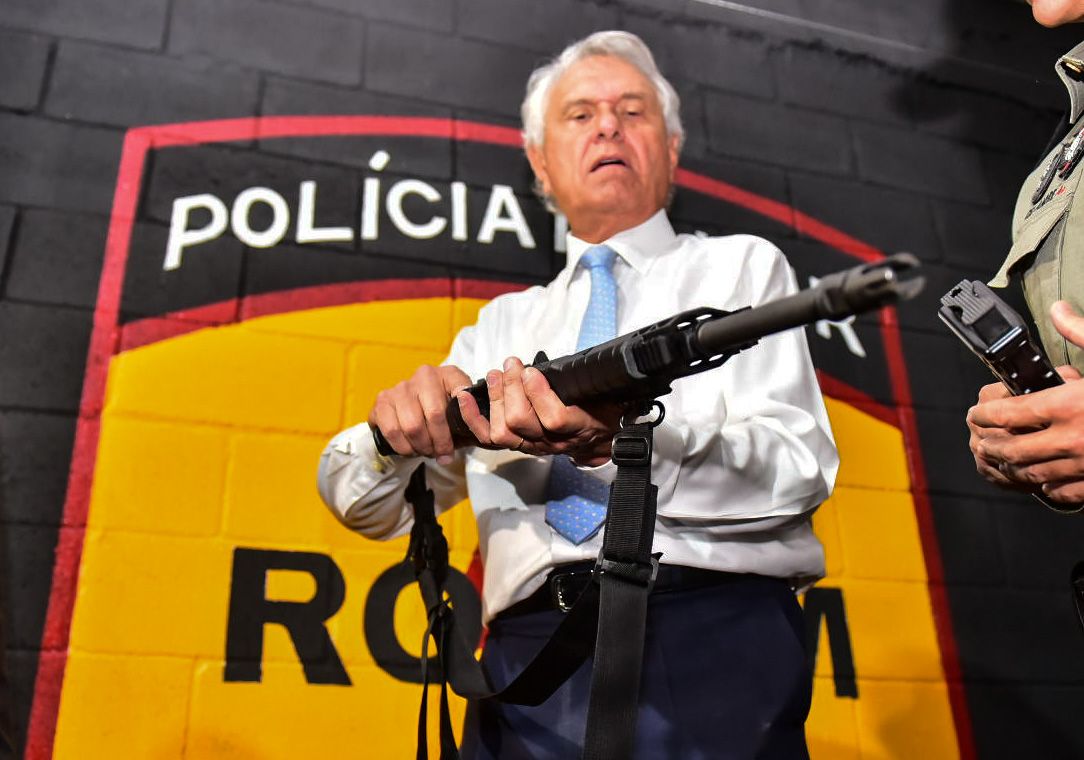 O governador Ronaldo Caiado posou, ao lado de policiais, com um fuzil ARX 200.