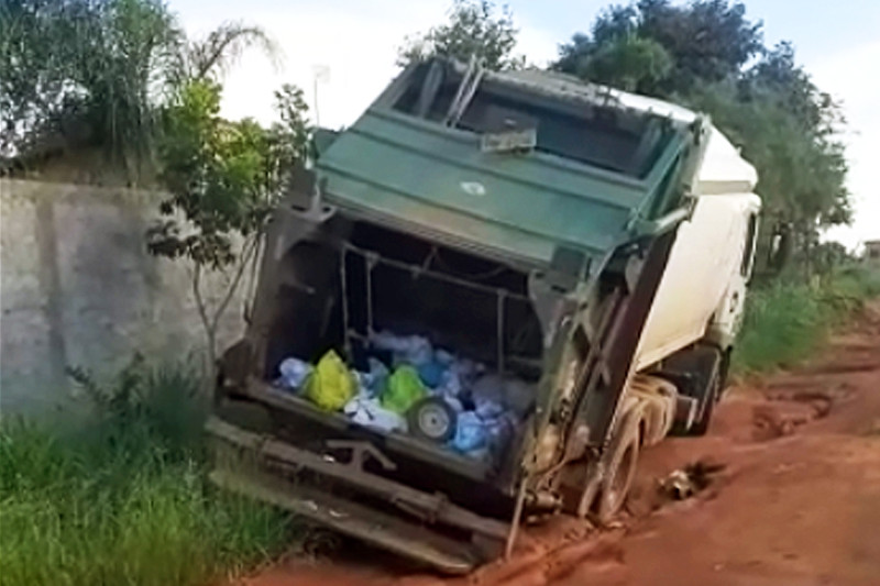 Caminhão da coleta de lixo de Aparecida atola em erosão