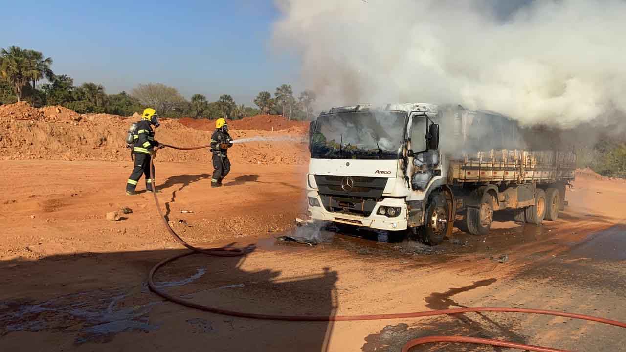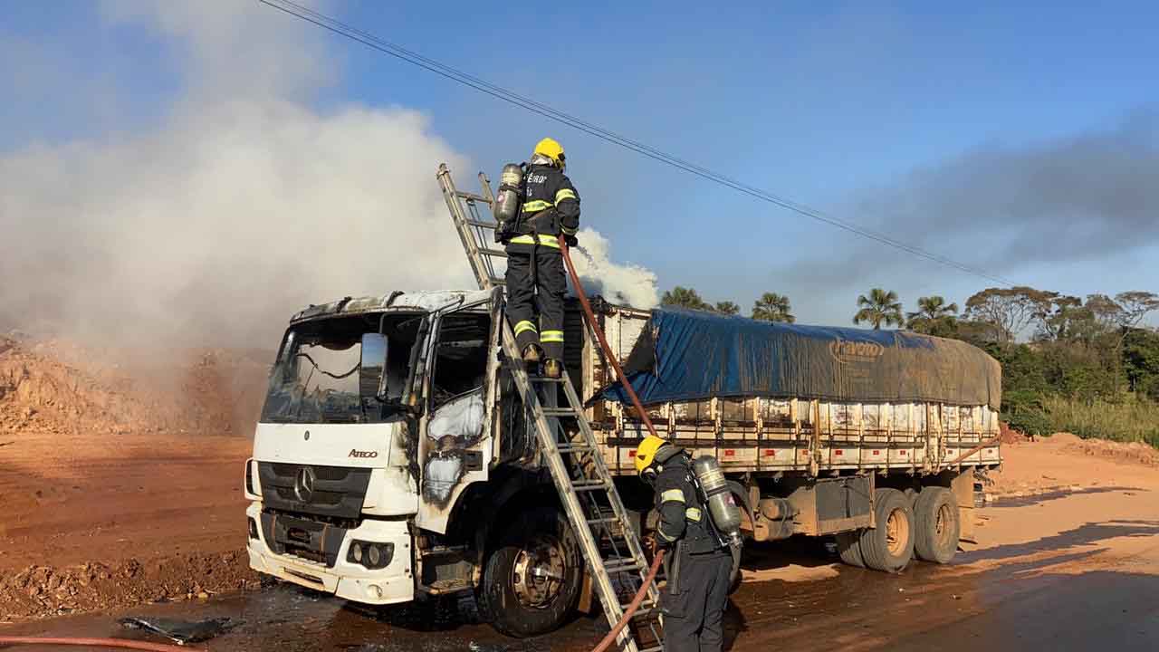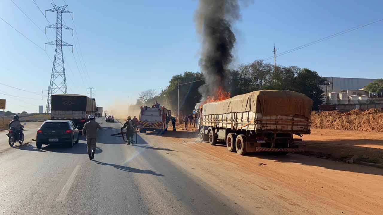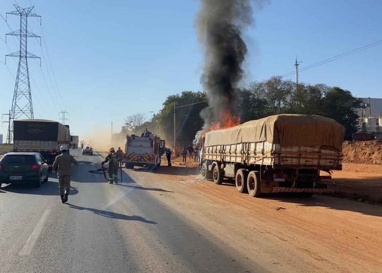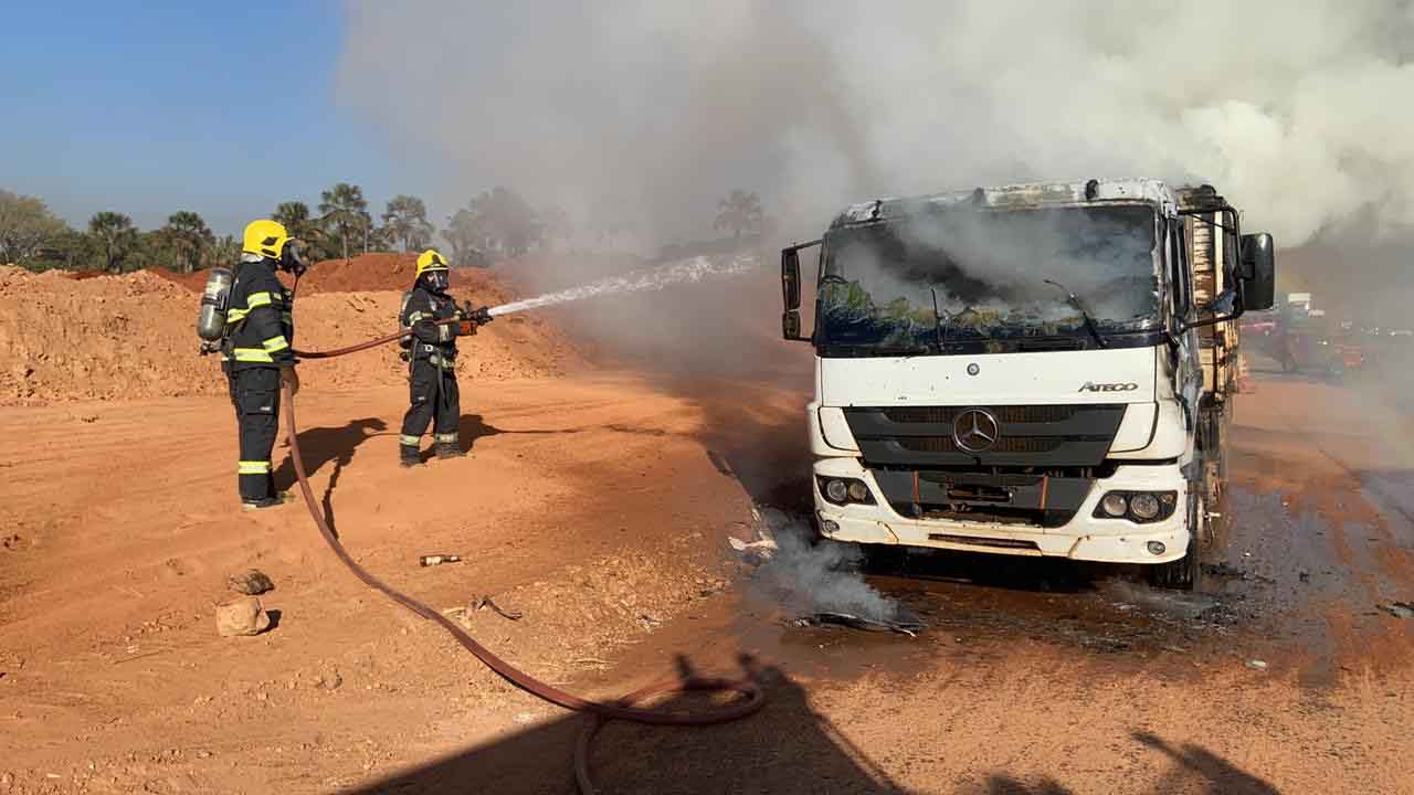 Na manhã desta 5ª feira (12), um caminhão carregado de melancia pegou fogo no Anel Viário, no Polo Empresarial Goiás, Etapa 1, em Aparecida de Goiânia.