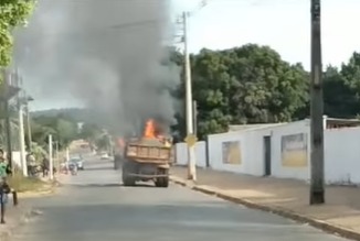Um caminhão carregado de areia pegou fogo em frente à Escola Dom Fernando, na avenida Tesourinha, no jardim Riviera, em Aparecida de Goiânia.