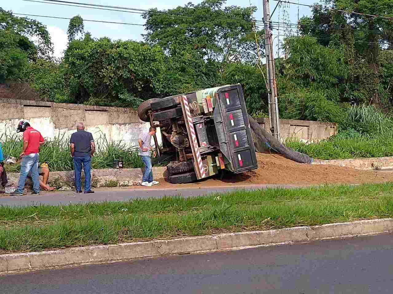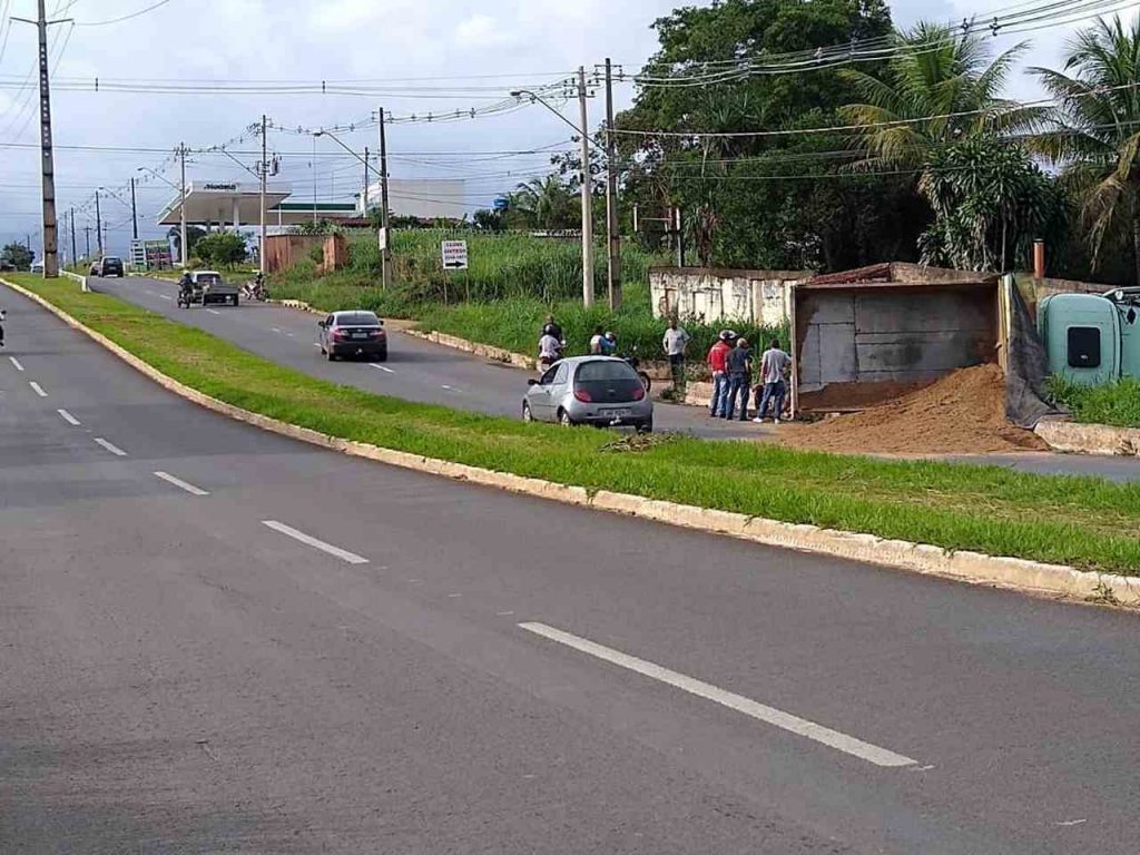 Um caminhão carregado de areia tombou na Avenida Brasil, sentido à base da GCM, no Parque das Nações, em Aparecida de Goiânia.