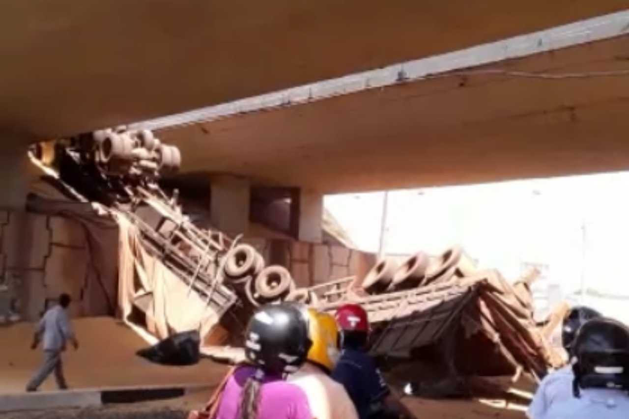 Um caminhão tombou no viaduto da BR-153 com a Avenida Afonso Pena, em Itumbiara (GO), a cerca de 200 km de Goiânia.