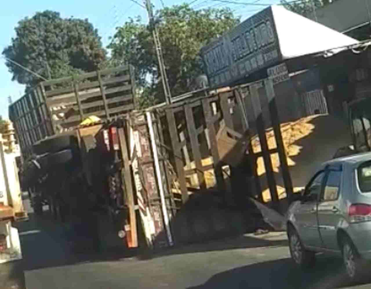 Caminhão tombou na Avenida V-008, no Mansões Paraíso, em Aparecida | Foto: Reprodução